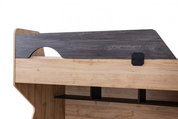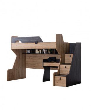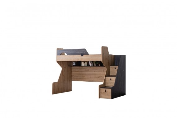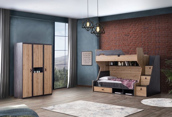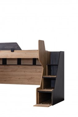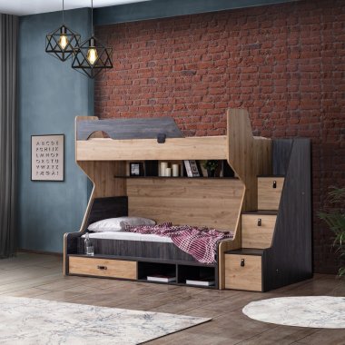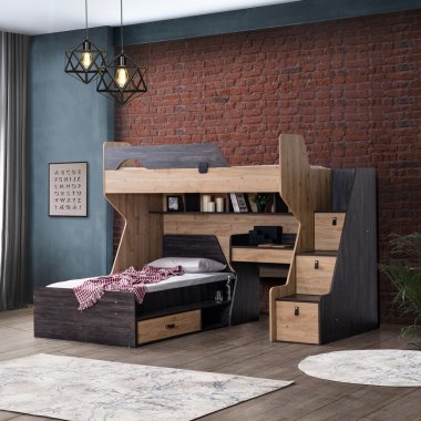 Müşteri tercihine göre merdiven sola ya da sağa eklenebilir. Merdiven üç çekmeceye sahiptir. Karyola ranza içine dik yada yatay eklenebilmektedir. Birinci ve ikinci yatak ölçüler 90x190 cm'dir. Materyal: Suntalam.